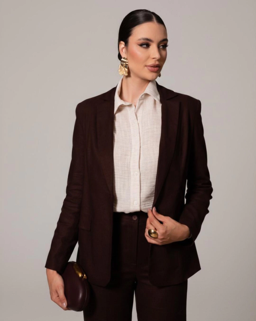 A alfaiataria ganha força nessa temporada, trazendo poder e modernidade aos looks. Invista neste blazer, ao lado da calça de linho, blusa lisa, maxi brinco, chocker minimalista e sandália de salto.