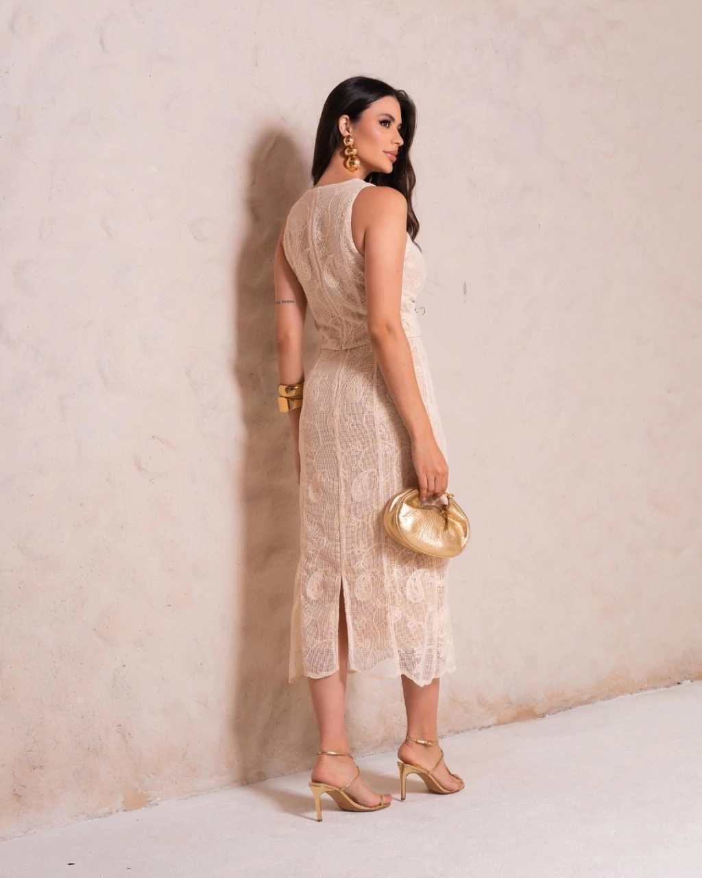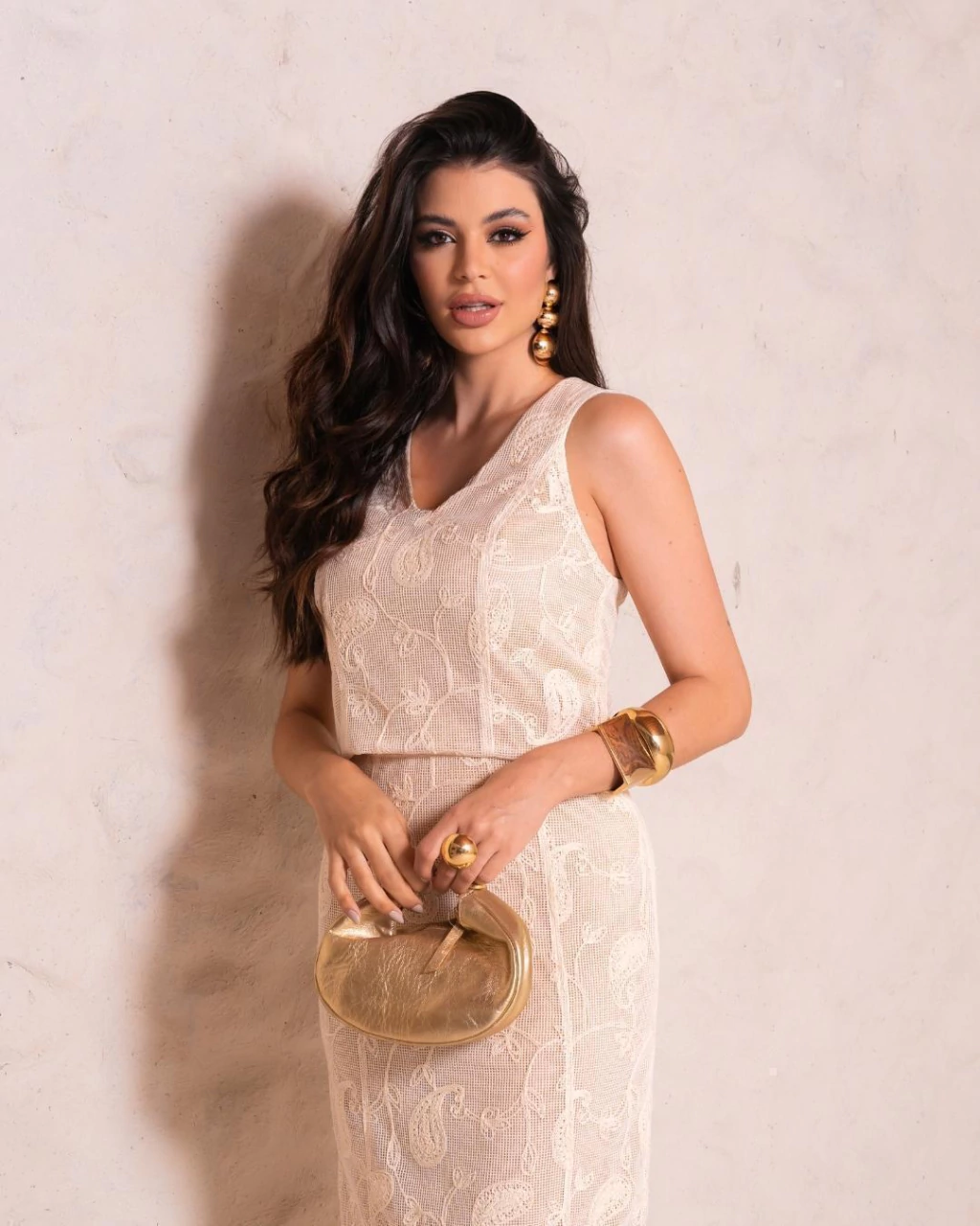Este conjunto carrega o charme das tramas delicadas e o poder dos detalhes feitos para durar. O bordado em tela confere textura e profundidade ao look, criando uma estética leve e impactante. Ideal para produções de fim de tarde ou celebrações em que o natural se encontra com o sofisticado.